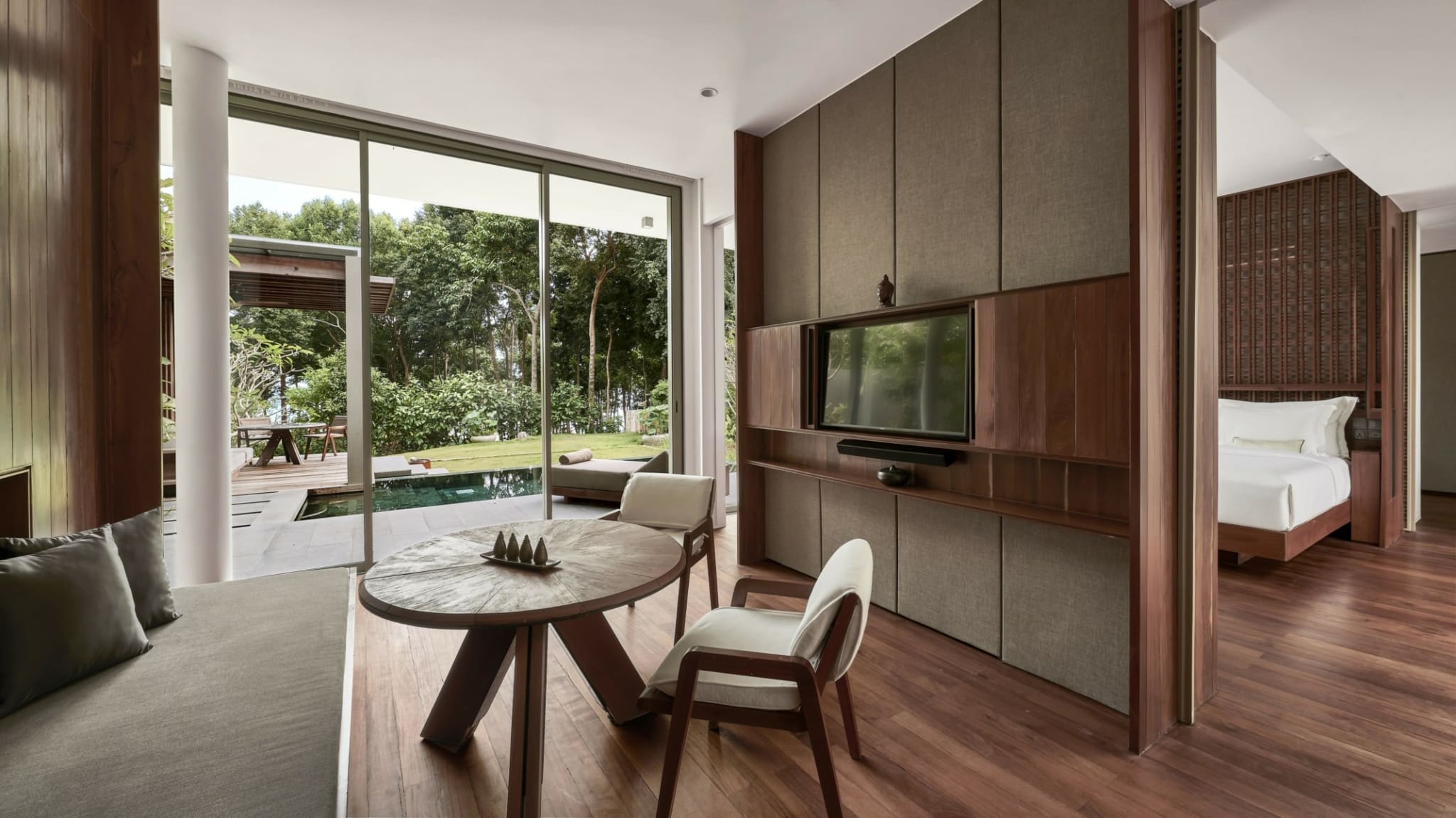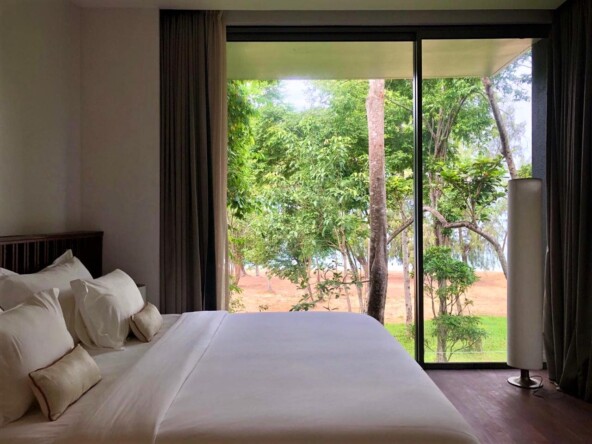 2-Bedroom Beachfront Villa – Sleeps 4: Two bedrooms, living area, kitchenette, and private pool.