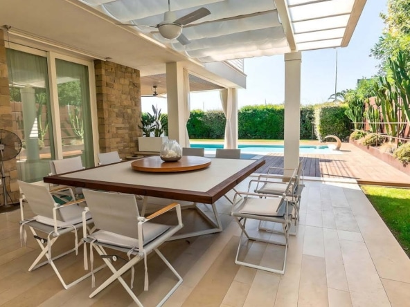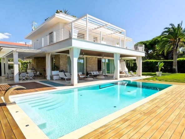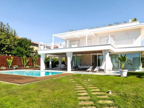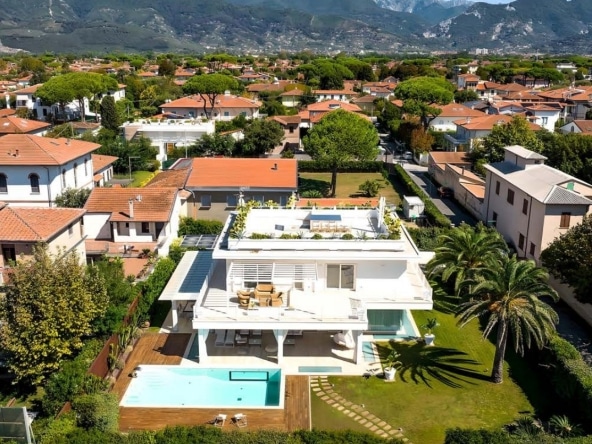 Recently restored to the highest standards, the villa features a beautifully manicured garden with a private swimming pool, state-of-the-art interiors, and direct beach access. Every detail has been thoughtfully designed to create a refined and relaxing retreat just steps from the beach and the center of Forte dei Marmi.