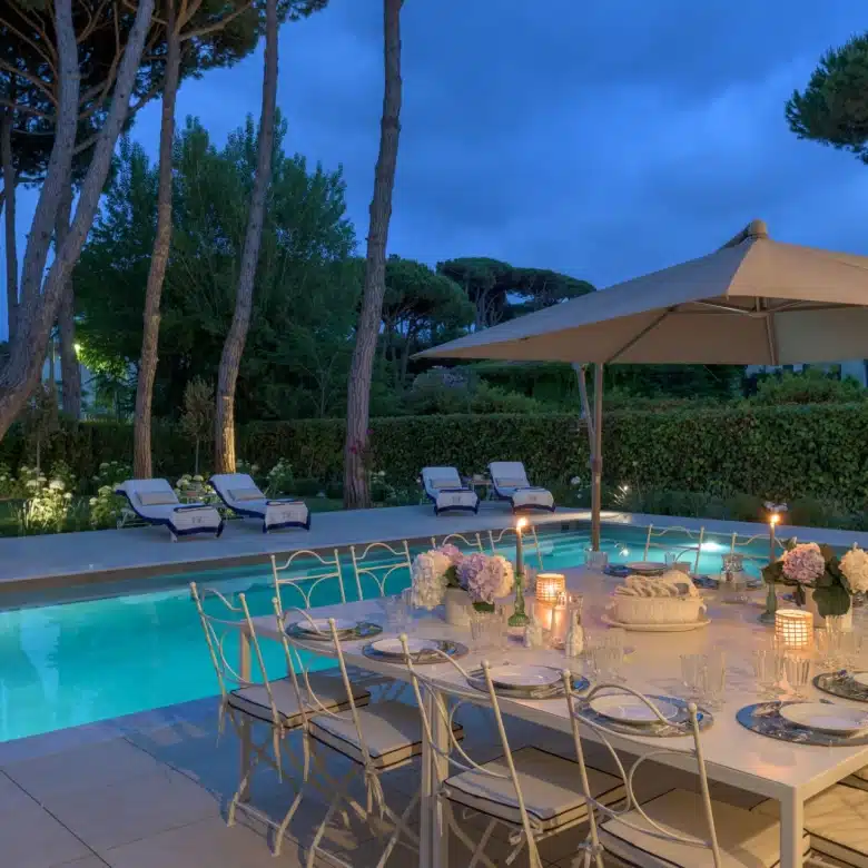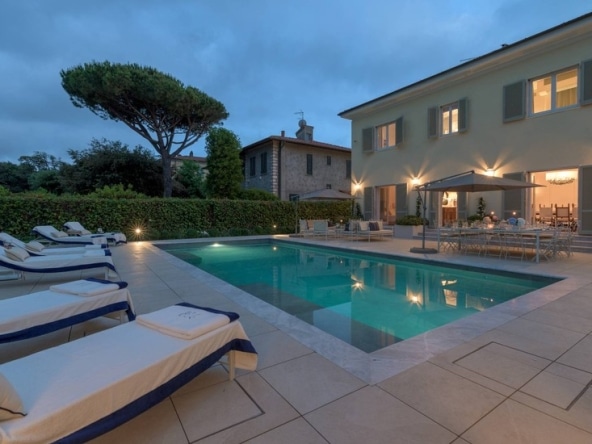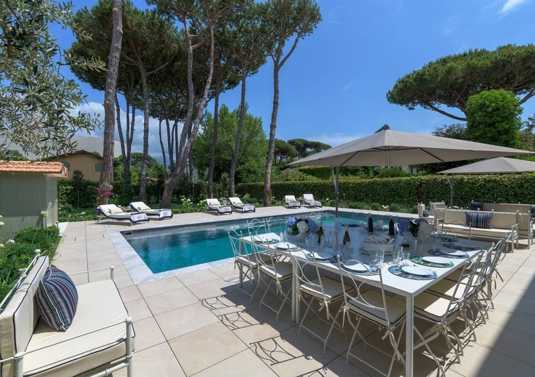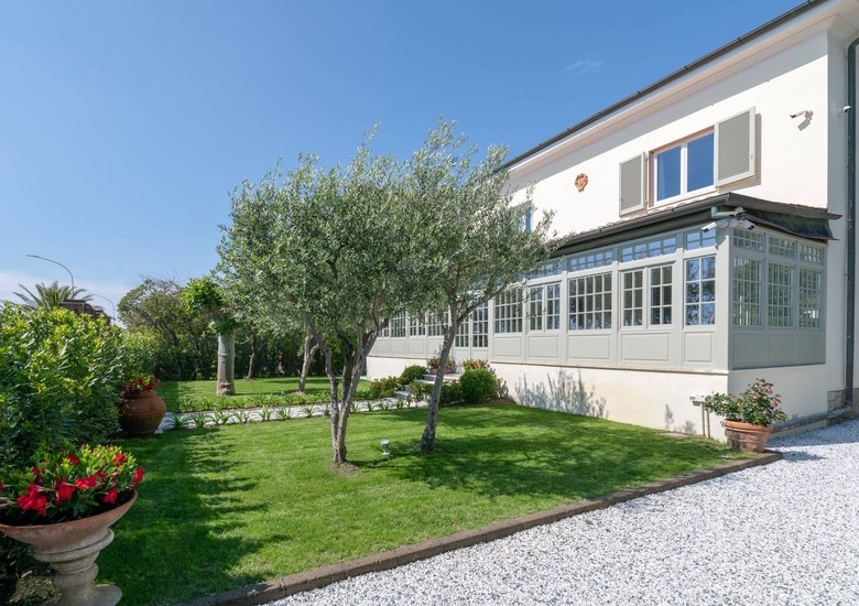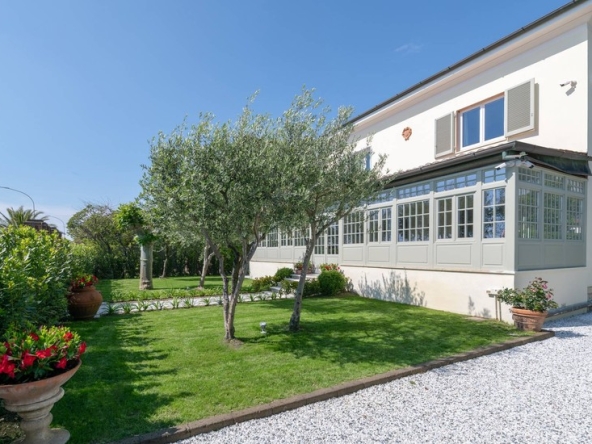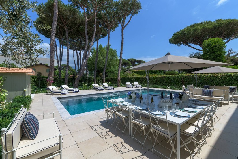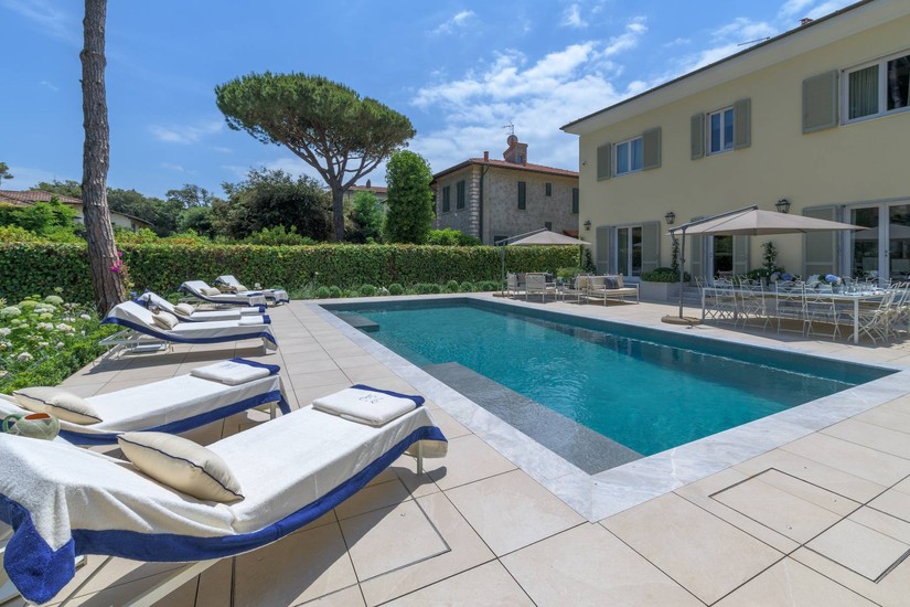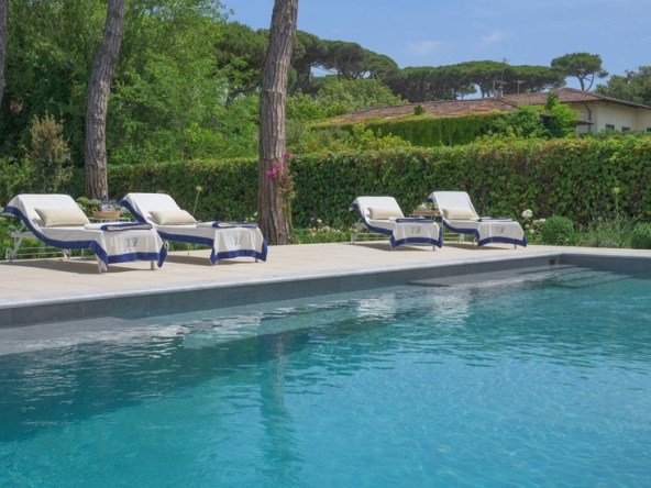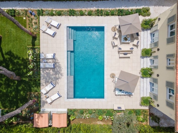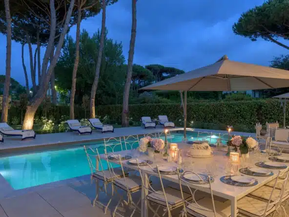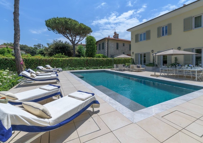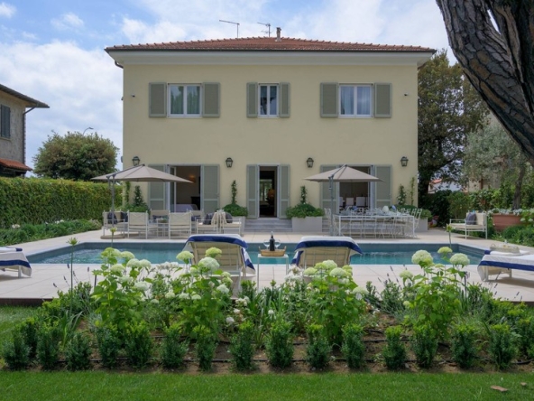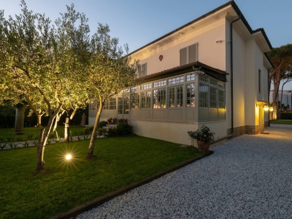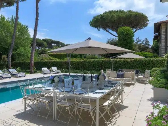 Villa Romana is an elegant seaside residence in the exclusive Roma Imperiale area of Forte dei Marmi. The recently renovated property blends modern design with classic Tuscan charm, offering seven bedrooms, six bathrooms, a landscaped private garden, and a swimming pool. Its position just steps from the sea provides both privacy and convenience.