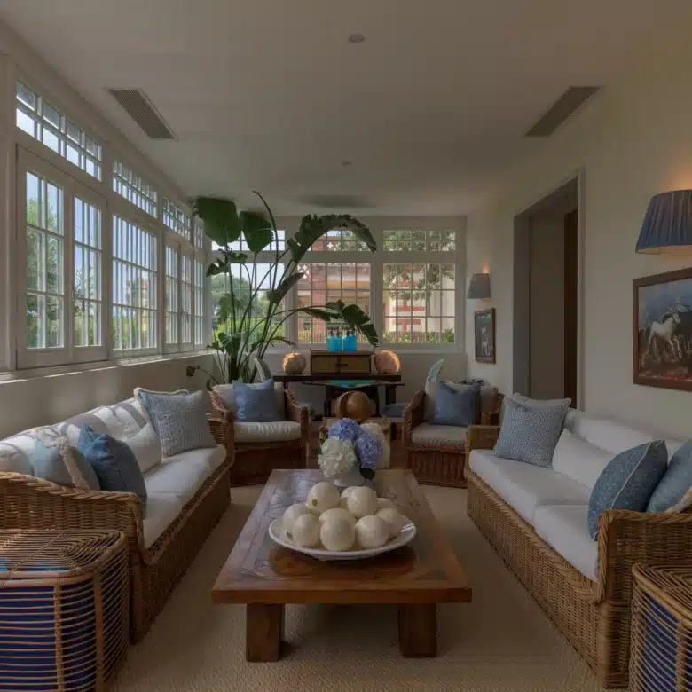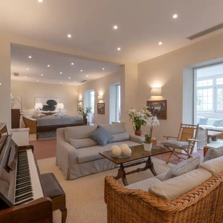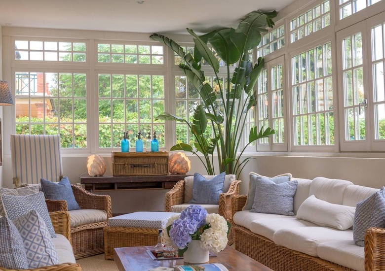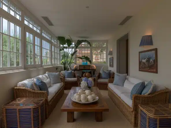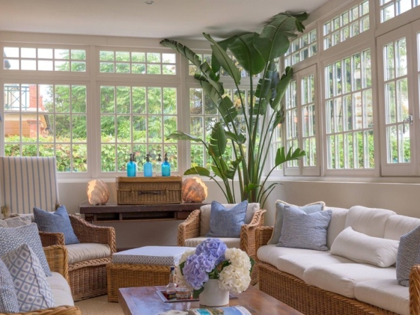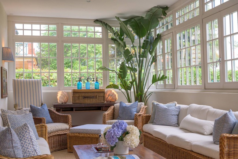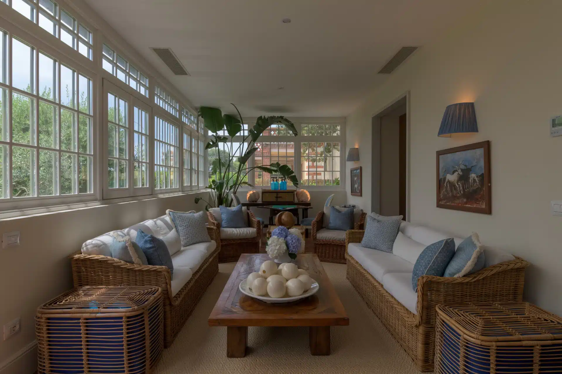 The interiors reflect a sophisticated coastal style, combining natural light, soft tones, and high-quality materials. A bright verandah overlooks the garden, while the main living area offers generous seating and a welcoming atmosphere.
