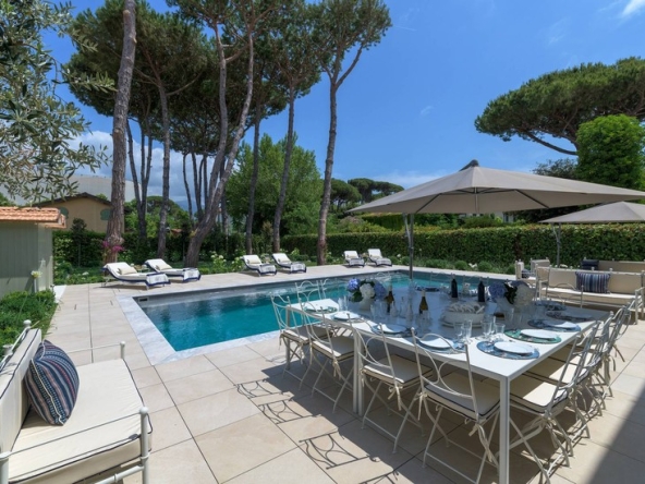 The landscaped garden is a central feature of the property, with refined outdoor spaces ideal for dining and relaxation. Guests can enjoy two large al fresco dining areas, comfortable sunbeds, shaded lounges, and a swimming pool surrounded by greenery. The combination of space, privacy, and proximity to the beach creates an ideal setting for outdoor living.