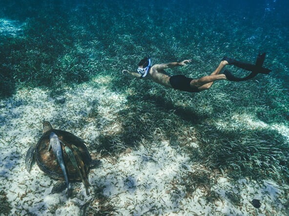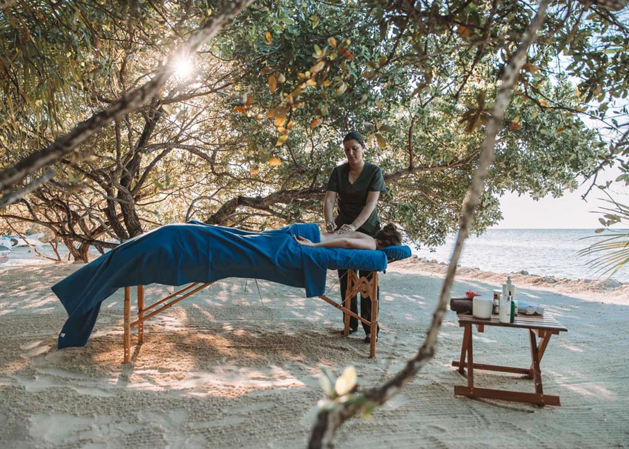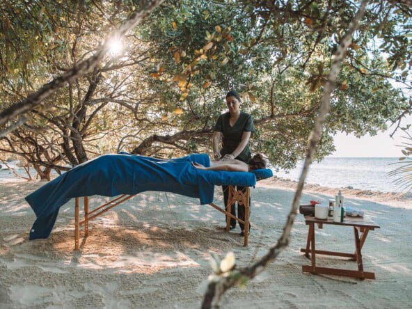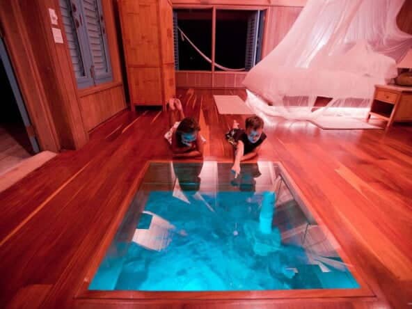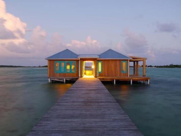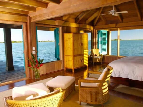 This unique bungalow is the most intimate, romantic, and most popular accommodation on the island. Villa Varinia is at the end of a dock that stretches over 150 feet off the island for the ultimate in privacy. Surrounded by the beautiful, turquoise blue Caribbean Sea, Villa Varinia is a picture-perfect window into the exotic water world of Belize. Guests are always enchanted by all of the sea life swimming right past or under their bungalow.